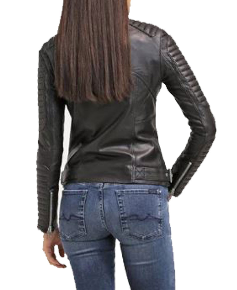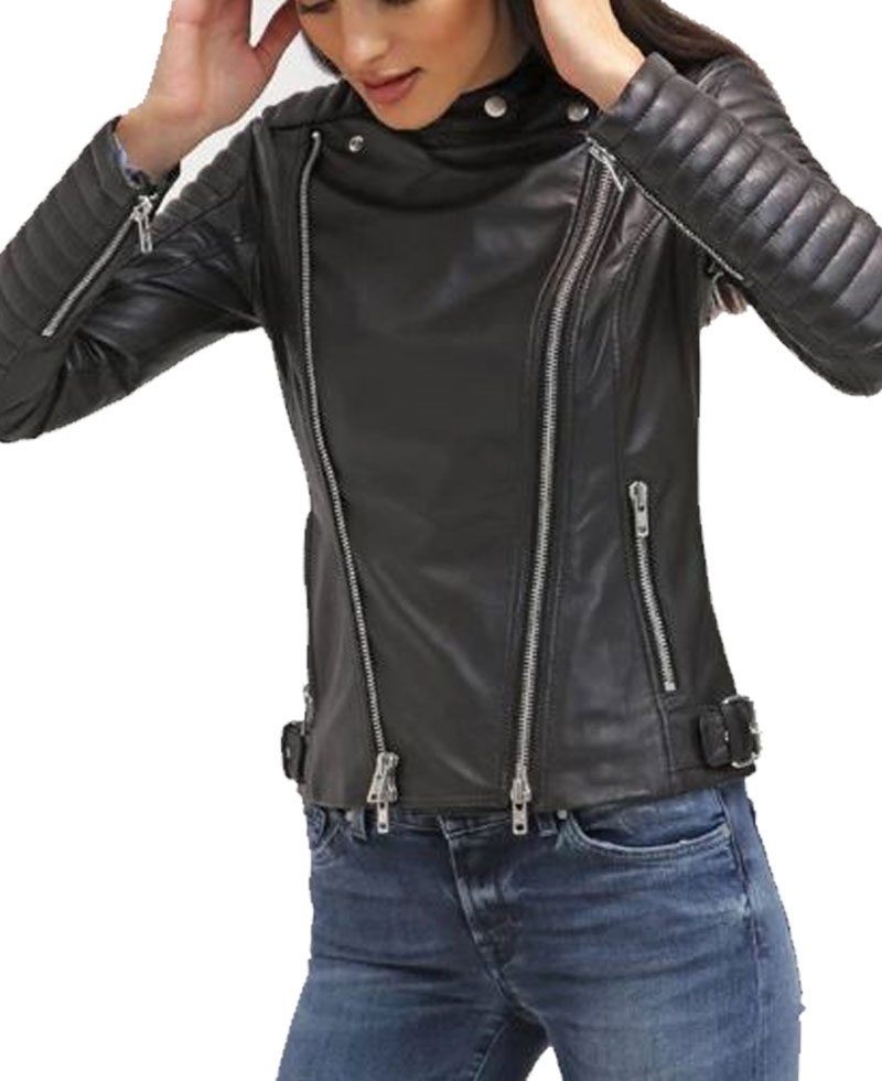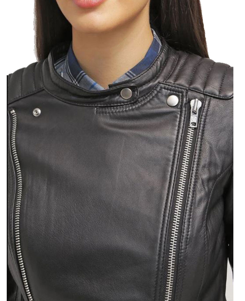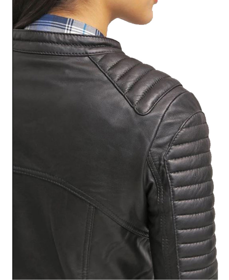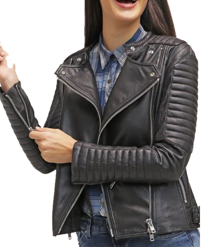 The women’s black leather biker jacket is a very demanded garb. The external part of this leather jacket is made from genuine leather material. On the inside fo this jacket, there is a lining of soft and comfortable viscose that will keep you warm and comfortable. It has a black mesmerizing color that brightens the looks of this leather attire. The women’s padded leather jacket has a snap tab style collar. On the front of this classy and stylish black leather biker jacket is a ykk branded zipper that fits in perfectly with the style of this jacket. It has zipper cuffs on full length style sleeves. The front side waist zipper pockets makes the appearance of this women’s black leather biker jacket more desirable.