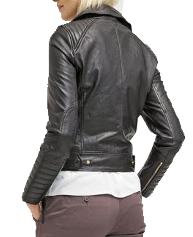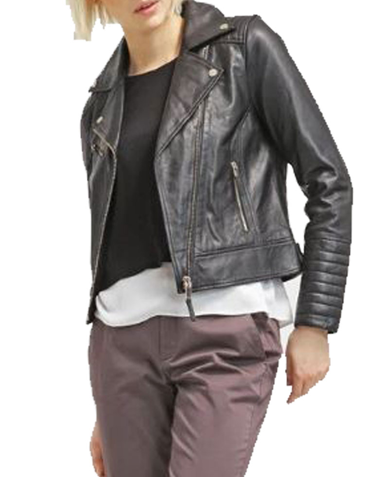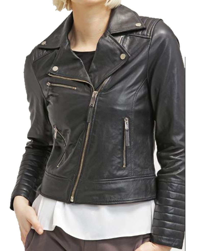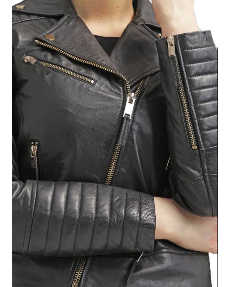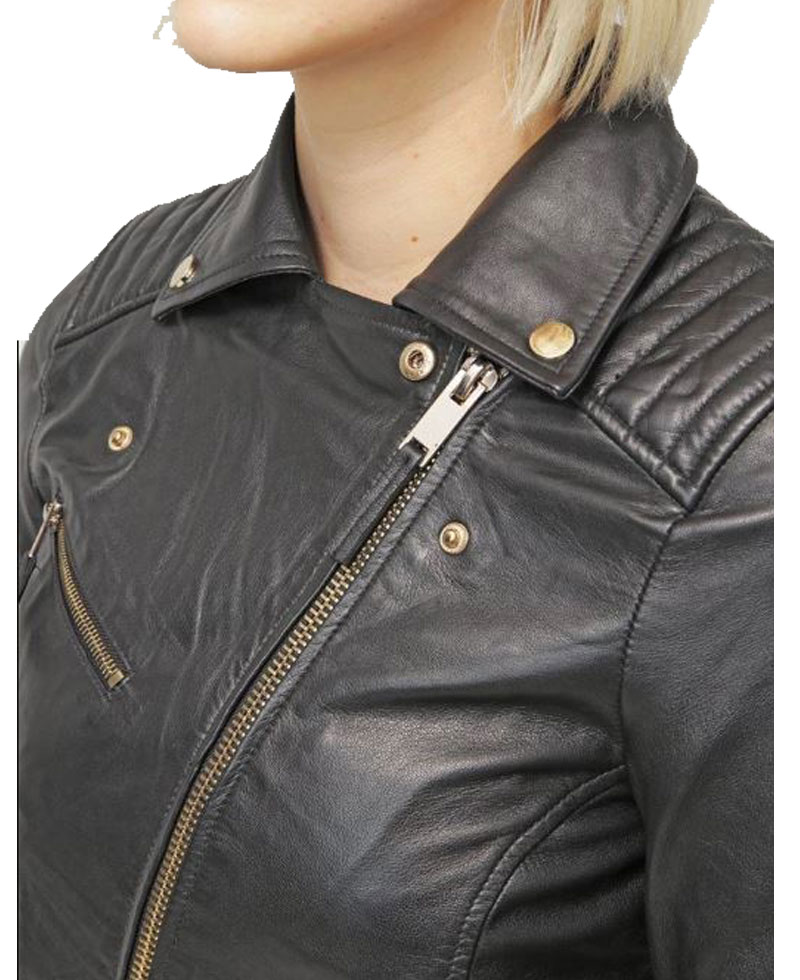 The women’s black leather biker jacket is our top selling product with its enduring quality and fine stitching that makes it lasting to wear. The external side of this biker jacket is manufactured from high quality genuine leather material. On the inner side of this jacket, there is a lining of soft and comfortable viscose that will keep you warm and comfortable. It comes in black color. The women’s asymmetrical black leather jacket has front ykk branded asymmetrical zipper style for the closure. It has zipper front side waist pockets and zipper chest pockets. The padded shoulder and sleeves of this leather jacket will make you more attractive. It comes with zipper cuffs on full length sleeves. The leather biker jacket has a notch lapel style collar.