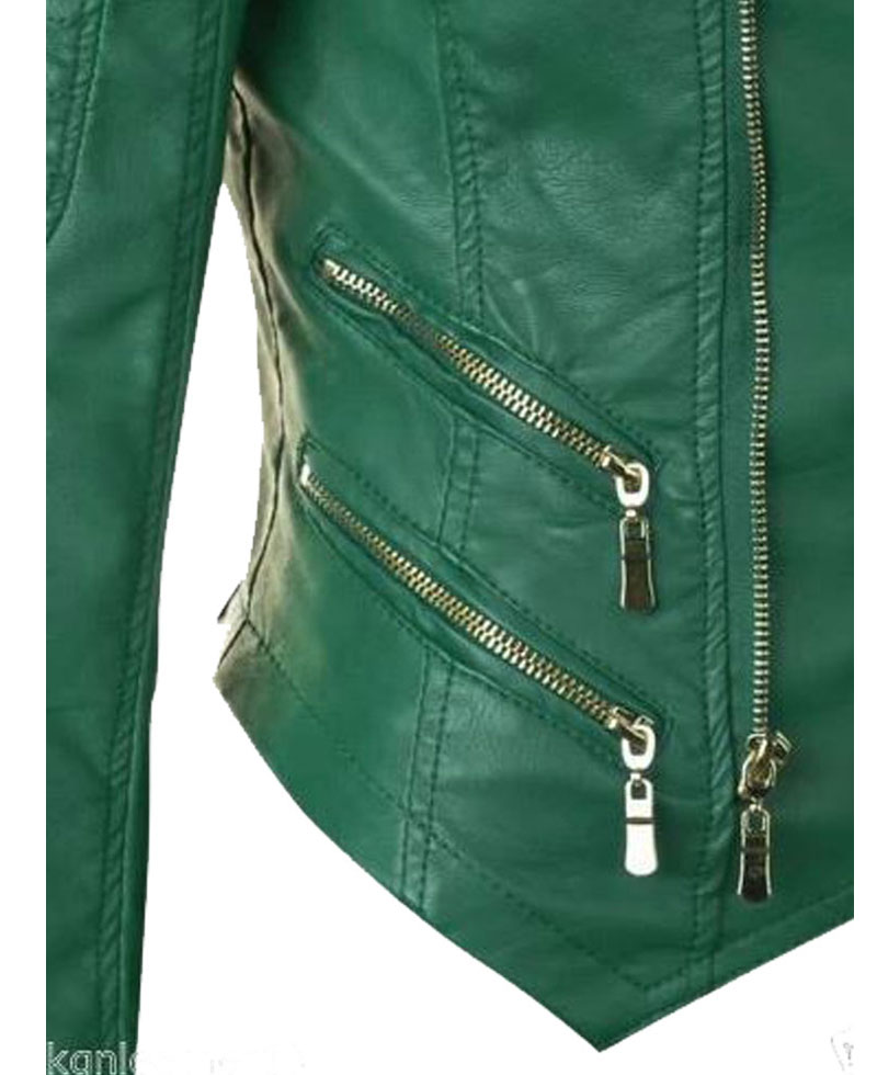Women's FJ091 Motorcycle Zipper Pockets Green Leather Jacket