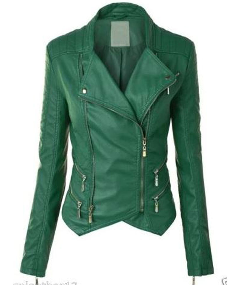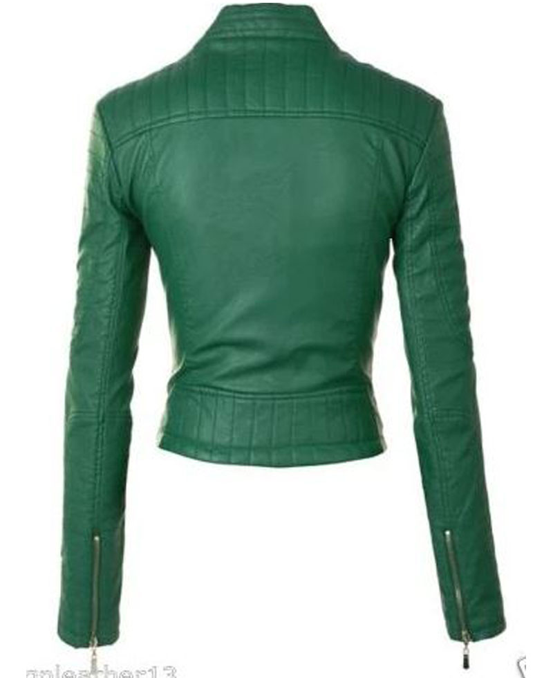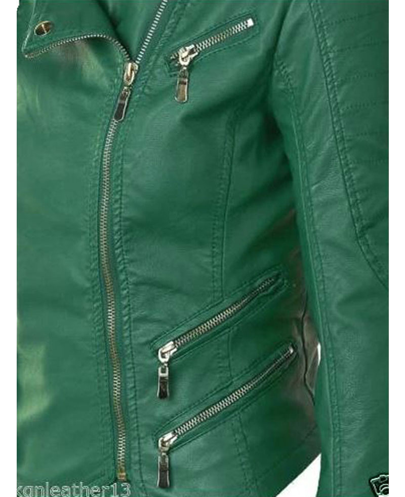 If you are looking for something stylish and trendy to wear this winters, then you are at the right place. The material we used in the manufacturing of this apparel is high quality genuine leather that makes the apparel long lasting and fine. It comes with internal soft and comfortable viscose lining. The women’s green biker leather jacket has front ykk branded asymmetrical zipper style closure. On the front of this women’s green biker leather jacket, there are multiple pockets with zippers that will makes the appearance of the frontal attractive and will also give you space for keeping stuff. The women’s asymmetrical green jacket has a notch lapel style collar. It comes with full length style sleeves on zipper style cuffs.