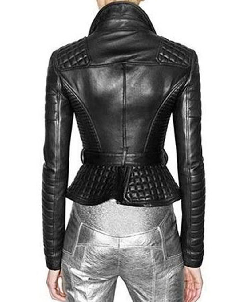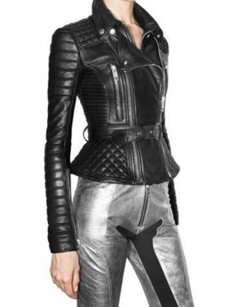 Women’s black leather biker jacket is manufactured from high and premium quality of genuine leather material. On the internal side of this apparel, there is a coating of soft and comfortable viscose lining that will keep you warm and comfortable. It comes in black color. Women’s padded jacket has a shirt style collar. It comes with front appealing and attractive ykk branded asymmetrical zipper closure that fits in perfectly with the style of this apparel. It comes with front zipper pockets. There are zipper style cuffs on full length style sleeves of this women’s padded jacket. The women’s black leather biker jacket has a belt around its waist for fastening. Also, it has padded shoulders and sleeves to make it more captivating.