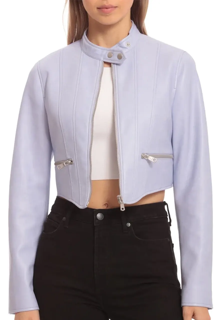 Wardrobes will stand out with this new, modern, attractive, light purple cropped jacket that is aimed at those women who desire a new, modern look. The soft pastel color gives a slight burst of color to any piece of clothing without being overly trendy in the shape of its cropped silhouette.