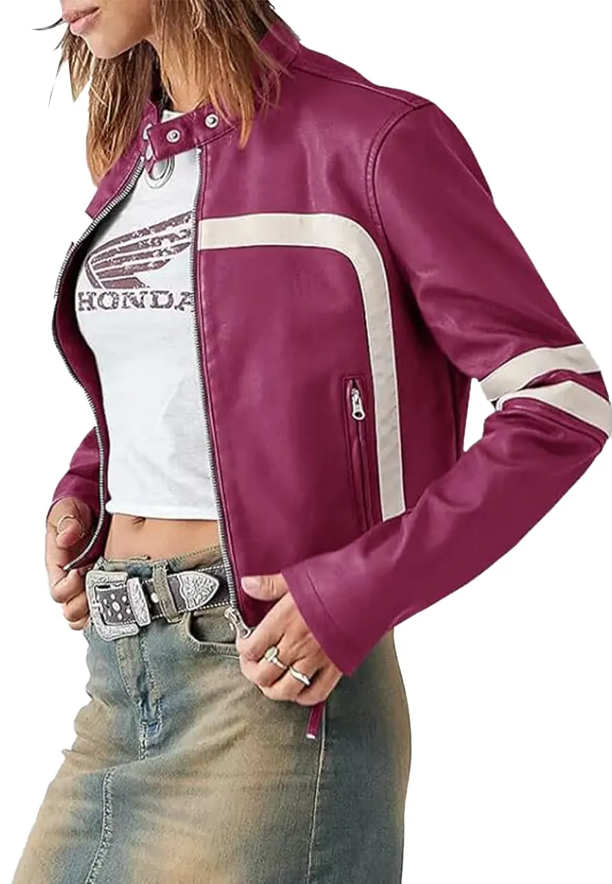 Women’s Purple Leather Cropped Motocross Jacket with Off-White Stripes