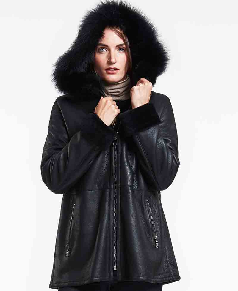 Women’s Shearling Black Leather Jacket With Trimmed Hood
