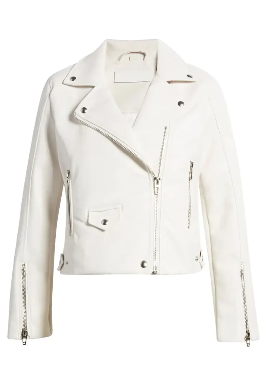 This white moto leather jacket can be worn with jeans, skirts, or dresses to create a modern and elegant appearance. The neutral type of it makes it an all-year-round wardrobe.