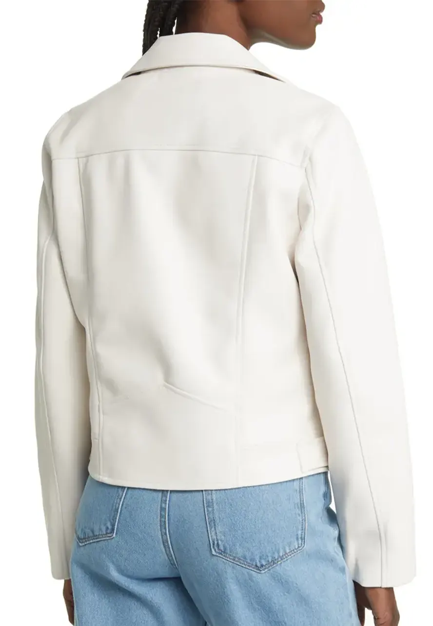 The jacket is made of high-quality leather or white faux leather moto jacket material and provides durable wear, comfort, and a smooth finish. The inner lining is soft fabric that makes it wearable throughout the day.