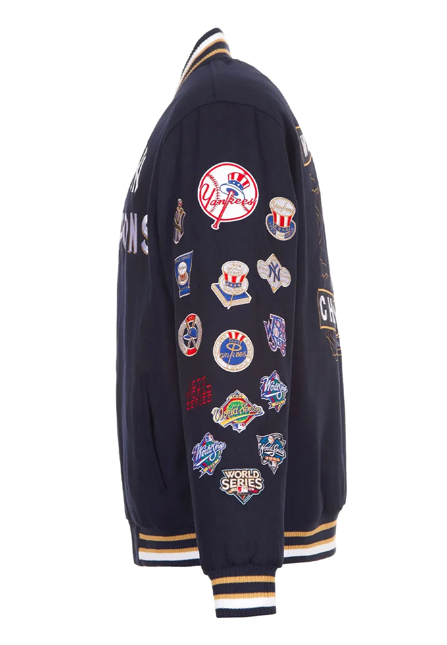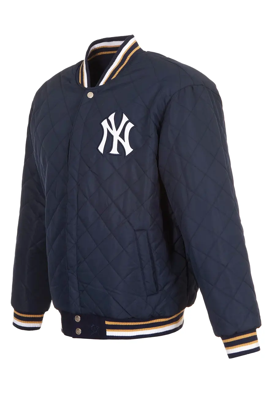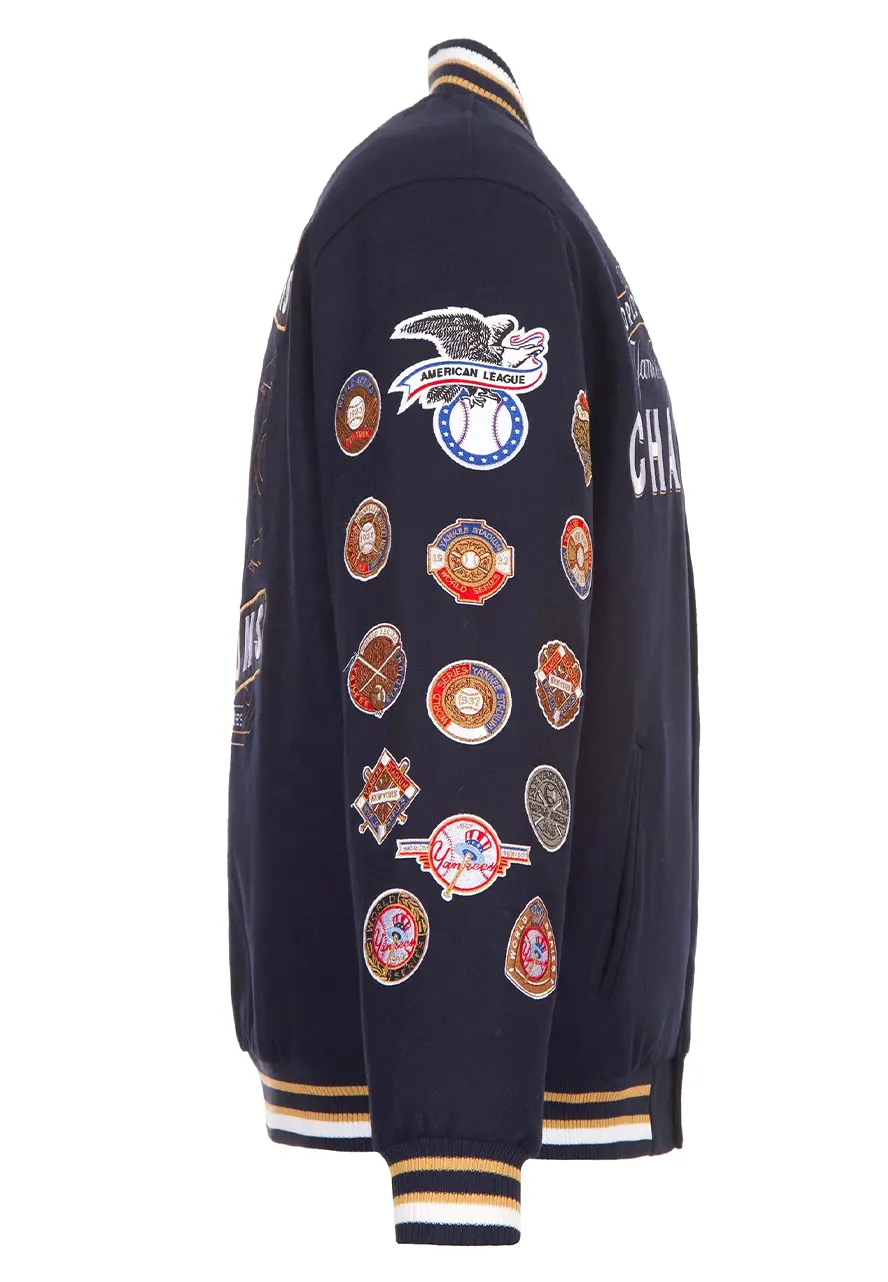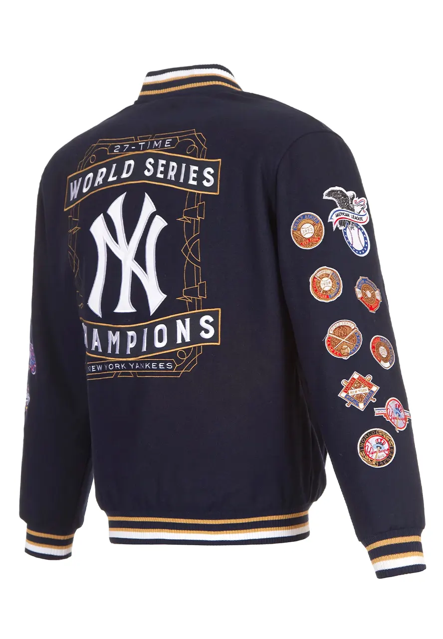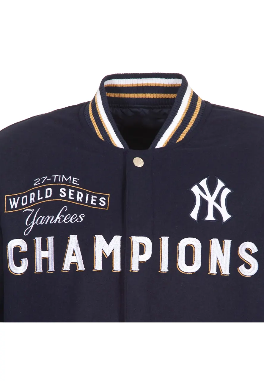 Stand out from the crowd while wearing the Yankees world series jackets, it is a must-have layering that can be worn day or night. The dapper jacket has been fabricated of premium-quality wool to make it warm and ageless, while its soft viscose inner makes it sweat-free and comfortable to wear. The strong black color will smarten your looks. The Yankees world series reversible jacket has been styled by using all smart features like a stand-up collar, snap tab buttoned closure, rib-knitted cuffs and hemline, and side waist pockets increasing its fashion and functionality. The Yankees world series bomber jacket will get you step into the fashion world and give you an iconic look.